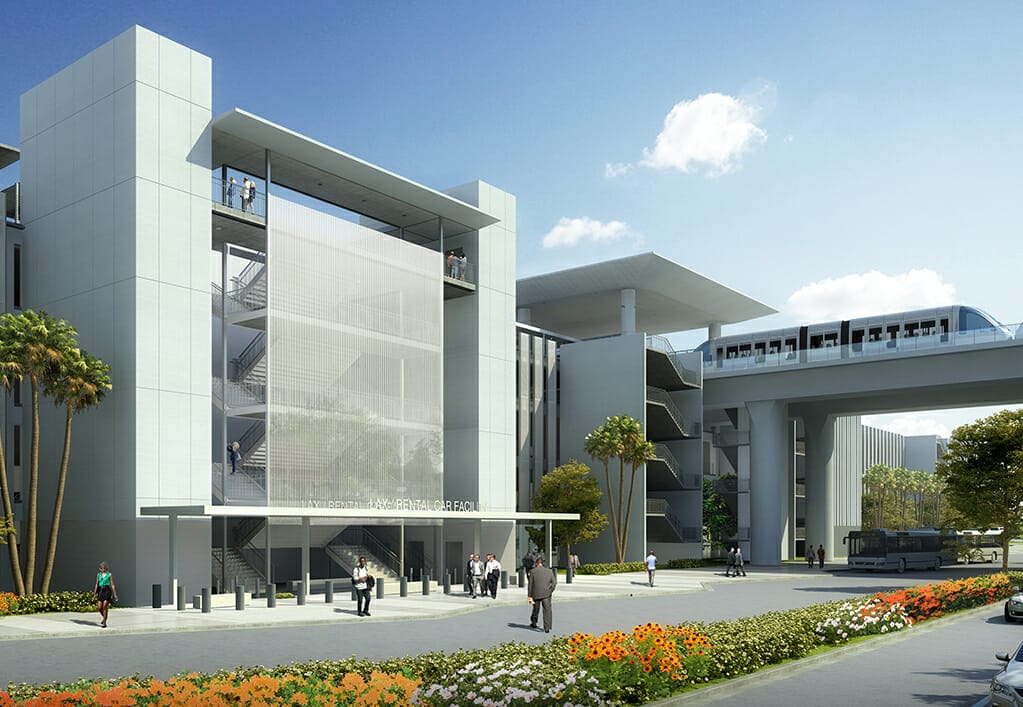 Arora Engineers (Arora) was selected to provide special systems design and engineering services for the new Consolidated Rent-A-Car Facility (ConRAC) at Los Angeles International Airport (LAX), a critical element of the Airports Landside Modernization Program (LAMP). This was a Private-Public Partnership (P3) contracting model, and Arora was part of the LA Gateway Partners team. LAMP aimed to alleviate congestion and provide better passenger movement within the existing Central Terminal Area (CTA), which the airport deemed necessary due to the nearly 6,000 vehicles that entered the LAX CTA each hour at peak traffic times. The major elements of the LAMP included the ConRAC, Intermodal Transportation Facilities, an Automated People Mover (AMP), improvements within the Central Terminal Area, a connection to the Metro Rail system, and various roadway improvements.