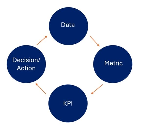 This simple but powerful process ensures the data facility teams track actually drive executive-level decisions. Instead of endless reporting, the focus shifts to a closed-loop system where data informs metrics, metrics create KPIs, KPIs shape decisions, and decisions trigger measurable action.