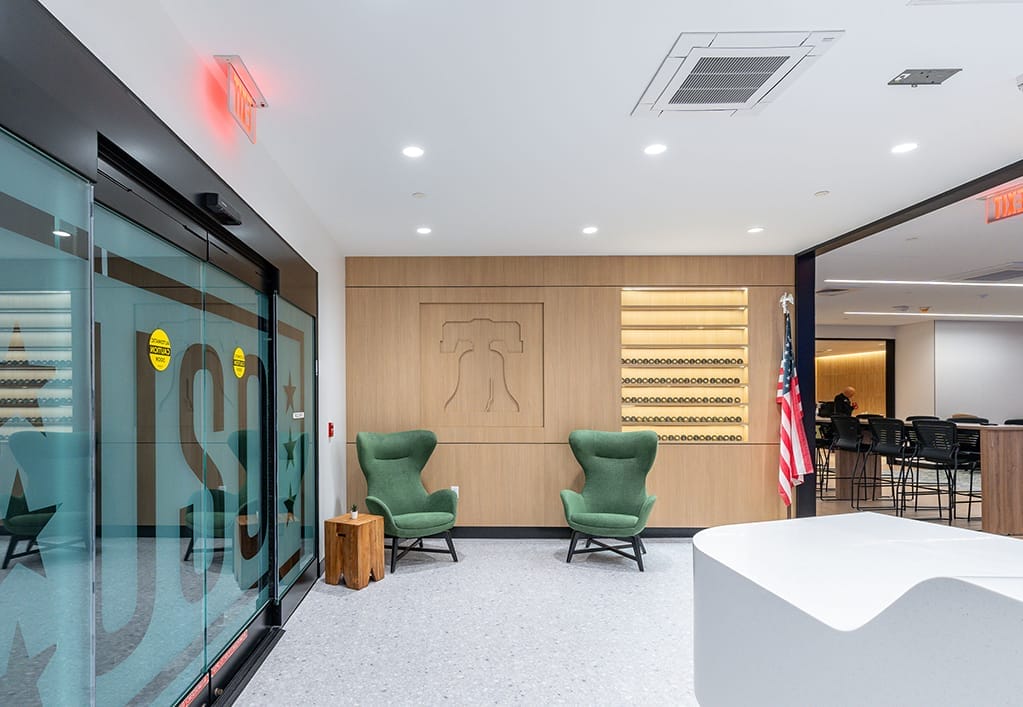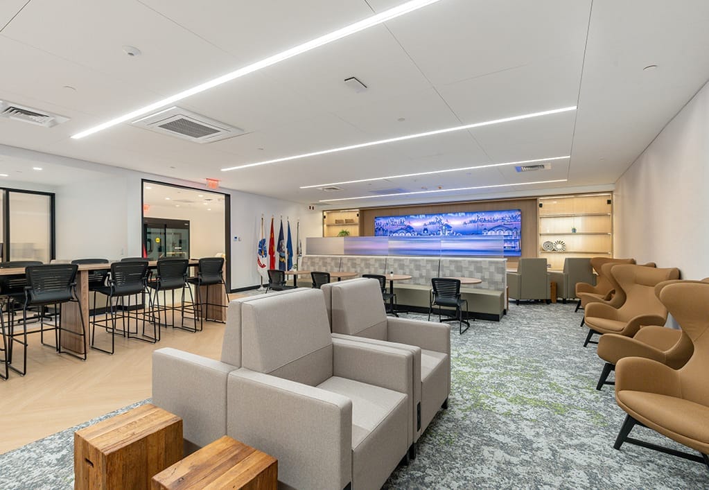 Arora Engineers (Arora) served as the prime design-builder for the relocation and complete interior fit-out of the USO Lounge at Philadelphia International Airport (PHL). Led by MarketPlace PHL, this initiative modernized and enhanced the lounge’s functionality, moving it to the Terminal D–E Connector. The previous USO space no longer met operational needs, and the new 2,830 SF lounge was designed to offer a more welcoming, comfortable, and accessible environment for military service members and their families.