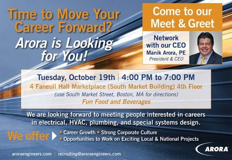 Time to move your career forward? Arora Engineers, Inc. is looking for you! Come to our upcoming Career Meet & Greet and network with our President & CEO, Manik Arora, PE and Vice President, New England, James M. Falvey, PE. Here at Arora, we offer career growth, a strong corporate culture, as well as opportunities to work on exciting local and national projects. We are looking forward to meeting people interested in careers in Electrical, HVAC, Plumbing, and Special Systems design. We will be providing fun food and beverages during this event. This is a great opportunity you do not want to miss!