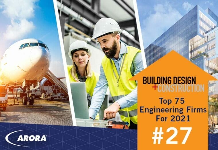Arora Engineers, Inc. (Arora) is proud to be featured in Building Design+Construction’s 2021 Giants 400 Report (formerly the Giants 300). This list consists of the nation’s largest engineering firms for nonresidential buildings and multifamily buildings work. This year, Arora ranked #27 in the overall Top 75 Engineering Firms, moving up from last year’s ranking of #33.