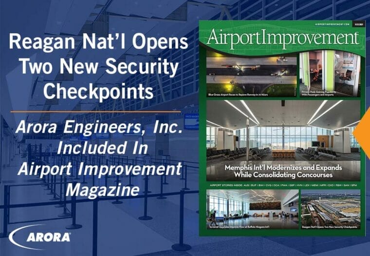 Arora Engineers, Inc. (Arora) was included in the November 2021 issue of Airport Improvement Magazine in an article entitled, “Reagan Nat’l Opens Two New Security Checkpoints.” The article discusses the opening of two new security checkpoint buildings at Reagan National Airport (DCA). The $269.8 million project was designed to heighten security at airport and to improve the screening experience for passengers and TSA officers.